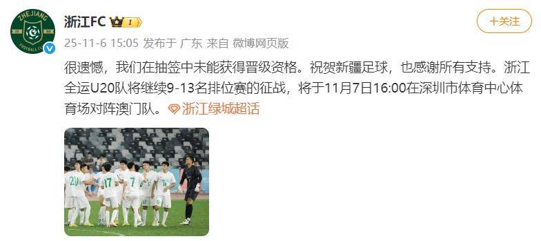 浙江FC官方发文:很遗憾,我们在抽签中未能获得晋级资格。祝贺新疆足球,也感谢所有支持。浙江全运U20队将继续9-13名排位赛的征战,将于11月7日16:00在深圳市体育中心体育场对阵澳门队。