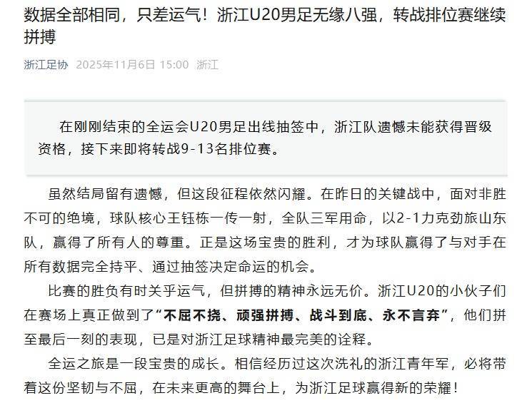 浙江足协随后发文回应:在刚刚结束的全运会U20男足出线抽签中,浙江队遗憾未能获得晋级资格,接下来即将转战9-13名排位赛。
